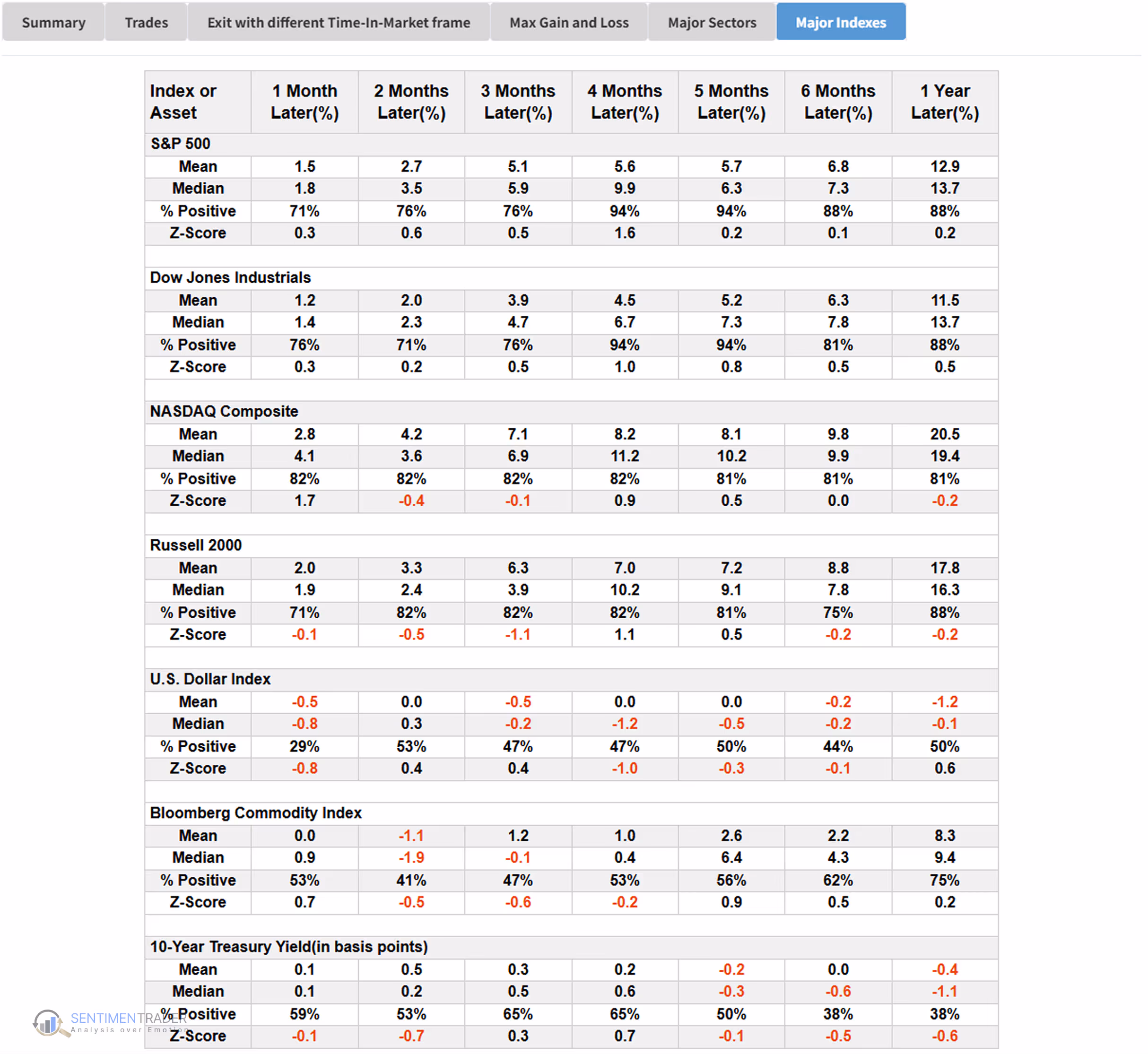 This backtest was run using SentimenTrader's Proprietary Backtest Engine, which lets you test your strategy with nearly 100 technical indicators and over 17,000 indicators covering Sentiment, Trend Score, Breadth, Macro, and Seasonality. No coding required.
