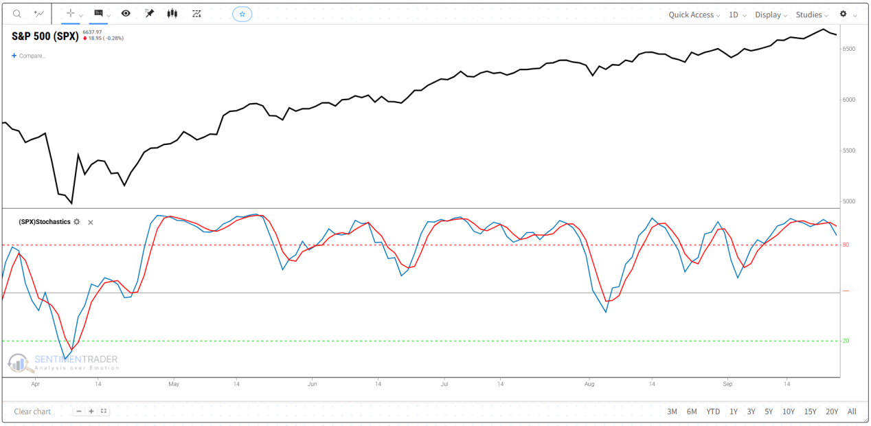 Overbought / Oversold levels: Readings above 80 suggest prices are near the top of their recent range; below 20 suggests they’re near the bottom.